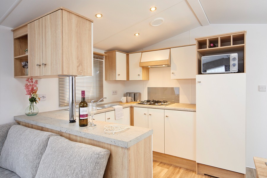 • Painted chassis • PVC Exterior Cladding • Tile roof • Exterior light • Reversible Tow-Bar facility • Double glazed • Truma Gas fire • Vaulted ceilings throughout • Sofa bed in living room • Cooker hood • Integrated fridge freezer (1225mm) • 4 ring hob • Microwave space • Totally vinyl • Large shower cubicle